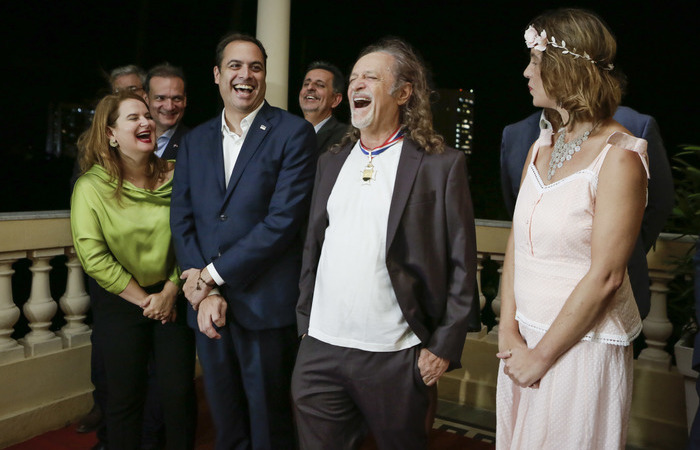 O artista pernambucano Alceu Valença recebeu, na noite desta quarta (12), a Medalha da Ordem de Mérito dos Guararapes, a mais alta honraria concedida pelo estado de Pernambuco. A homenagem referente aos serviços prestados para a cultura do estado foi entregue pelo governador Paulo Câmara na varanda do Palácio do Campo das Princesas. Estiveram presentes na solenidade os secretários Gilberto Freyre Neto, Rodrigo Novaes, José Neto e Érika Lacet, o presidente da Fundarpe, Marcelo Canuto, e a esposa do cantor, Yanê Montenegro. André Rio, Gerlane Lops, Nena Queiroga, Ed Carlos, Claudionor e Nonô Germano, Jota Michilles, Cristina Amaral e a banda Fulô de Mandacaru estavam entre os representantes da classe artística.